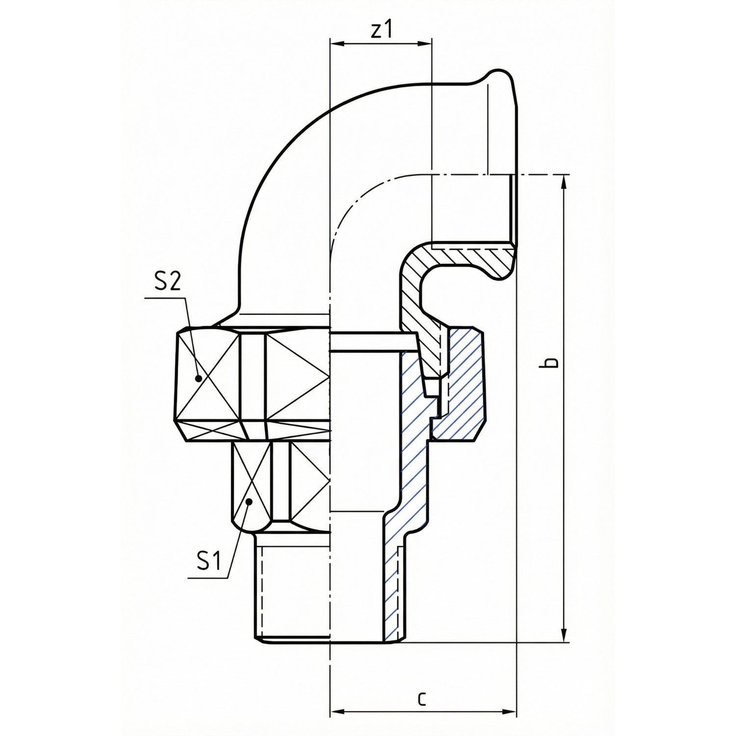 | Größe | DN | Ø Anschluss | b (mm) | c (mm) | z1 (mm) | s1 / s2 (Schlüssel mm) | B geschätzt (Gesamtbreite) | H geschätzt (Gesamthöhe) |